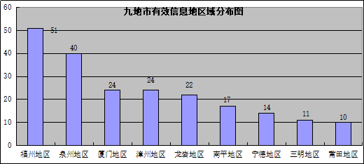 213件有(yǒu)效信(xin)息事項(xiang)地域(yu)分(fēn)布,福州地區(qu)51件,泉州地區(qu)40件,廈們(men)地區(qu)24件,漳州地區(qu)24件,龍岩地區(qu)22件,南(nan)平地區(qu)17件,寧(ning)德(dé)地區(qu)14件,三明地區(qu)11件,莆田地區(qu)10件。