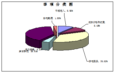 213件有(yǒu)效信(xin)息按事項(xiang)類别劃分(fēn),供電(dian)服務(wu)78件,占36.62%;市(shi)場(chang)準入19件,占8.92%;成(cheng)本(ben)價格與收費18件,占8.45%;電(dian)力(li)安(an)全9件,占4.23%;非(fei)電(dian)能(néng)源4件,占1.88%;其它事項(xiang)85件,占39.91%。